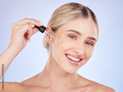 Face, portrait and skincare of woman with serum in studio isolated on a blue background. Dermatology, beauty cosmetics and happy female model apply hyaluronic acid, retinol or essential oil product.