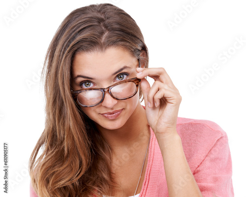 Face, portrait of a woman with her glasses and isolated against a transparent png background for eye care. Healthcare or protection of eyes, health wellness and female person with sunglasses
