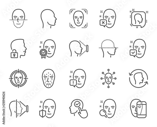 Face recognition line icons. Set of Faces biometrics detection, scanning and unlock system linear icons. Facial scan, identification and Face id symbols. Vector