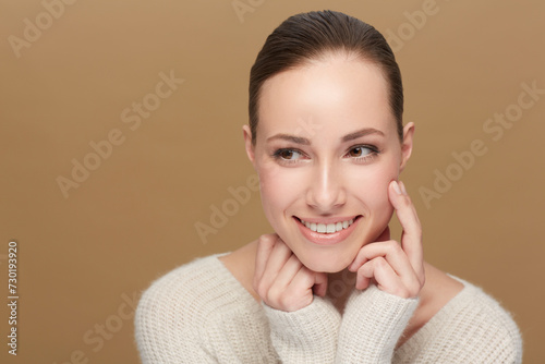 face, skin, woman, thinking, beauty, female, studio, natural, model, background, spa, healthy, health, care, skincare, wellness, space, happiness, cosmetic, cosmetic, dermatology, glow, brown background, young, girl, beautiful, fashion, happy, isolated, alone, hand, adult, smiling, smile, attractive, sensual, person, feminine, make-up, confident, pose, fresh, facial, hygiene, clothing, treatment