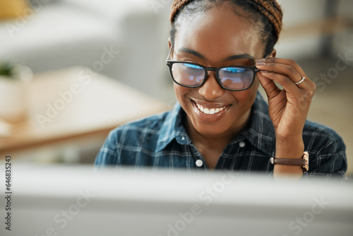 Face, smile and computer with a black woman in glasses working closeup in her home for remote employment. Happy, website and desktop with a young employee at work on her small business startup