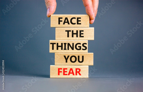 Face the things you fear symbol. Concept words Face the things you fear on wooden blocks on a beautiful grey background. Businessman hand. Business and face the things you fear concept. Copy space.