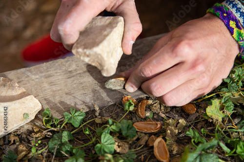 Faceless man crashing shells of almond nuts with stone on wooden plank