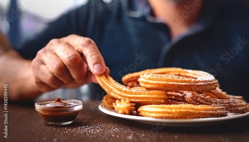 Faceless man eat Churros in restaurant with bokeh background. Spanish Food.