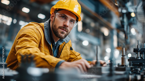 Faceless man in yellow jacket working on machine, industrial equipment operation, manufacturing worker scene, factory maintenance, with copy space