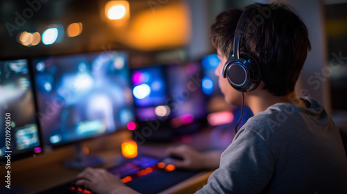 Faceless teenager playing video games at night with multiple monitors, colorful neon lights illuminating room, player wearing headphones focused on screen, immersive