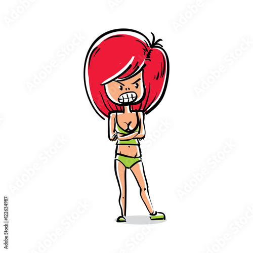 angry, furious, mad, shout, yell, coiffure, hair, beauty, sexy, lady, female, woman, girl, young, missy, posture, stylish, chic, pose, isolated, adult, people, person, personality, feature, caucasian, white skin, silhouette, design, graphic, art, hand-drawn, drawn, drawing, vignetting, hot, red-haired, red, face, illustration, vector, emotion, facial expression, gesture, cartoon, portrait, full-length, character