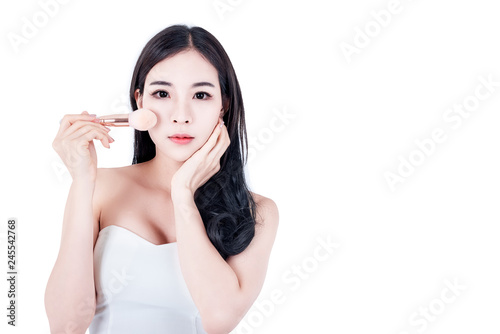 Facial Makeup. Close up of portrait asian attractive healthy girl with cosmetic powder brush for make up on face for perfect skin. Natural Make-Up beauty concept. Isolated on white background.
