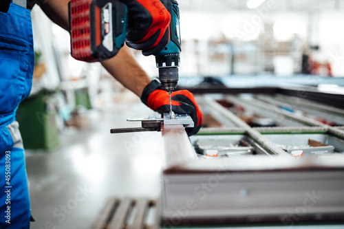 Factory for aluminum and PVC windows and doors production. Manual worker assembling PVC doors and windows and working with screw gun..