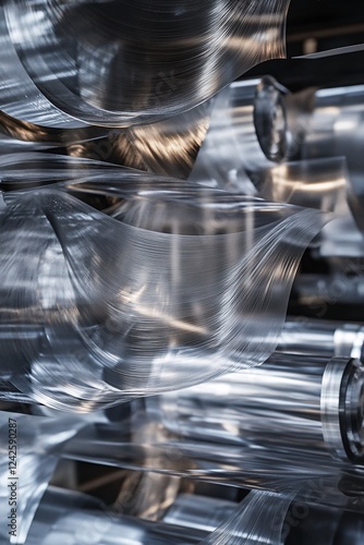 industrial, factory, production, line, manufacturing, machine, equipment, technology, plastic, film, transparent, cardboard box, cellophane, polyethylene, coil, winding, process, automatic, system, industry, manufacture, automated, closeup, detail, shiny, new, clean, metal, steel, aluminium, chrome, nobody, conveyer belt, assembly line, high technology, modern, innovation, precision, efficiency, robotic, advanced, quality, industrial revolution, futuristic, machinery, industrial design