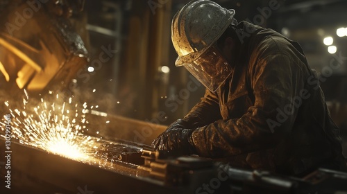 Factory worker in a hard hat and safety gear operating heavy machinery, sparks flying, realistic lighting, gritty industrial atmosphere