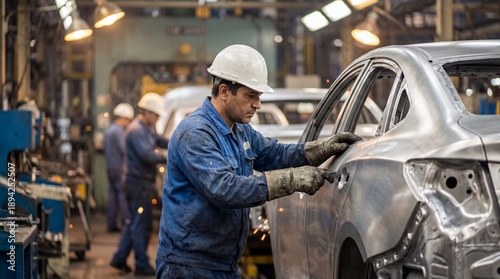 Factory worker inspecting a silver car body during the manufacturing process in an industrial setting with other workers present