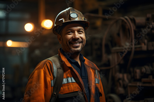 factory workers wearing hard hats and safety uniforms, smiling together. Portraying industrial worker engineering and illustrating concepts of industry, engineering, and construction.