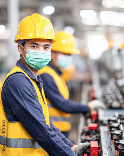 Factory workers wearing safety helmets and masks operate machinery in an industrial setting, highlighting workplace safety and productivity.