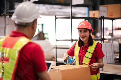 Factory worker,Shipping Team in Distribution Warehouse Packing Products for Delivery with Colleague Support