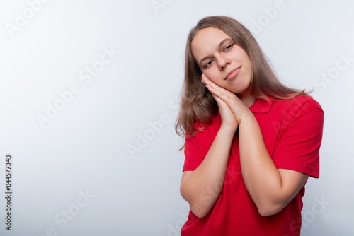 Fair-haired teenage girl dressed in a red T-shirt on a white background