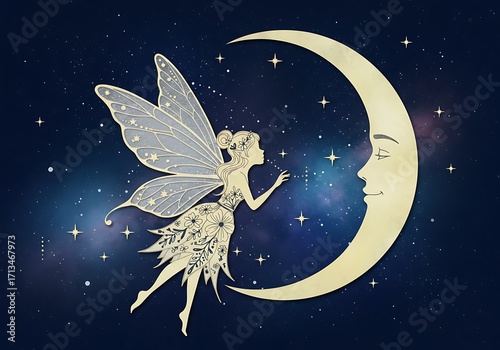 fairy, moon, fantasy, magic, night, star, celestial, dream, whimsical, silhouette, wing, girl, woman, character, myth