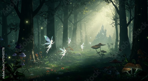 fairy, forest, fantasy, magic, flying, light, magical, nature, fantasy art, mythical, tree, mushroom, pathway, castle, imagination, whimsical, whimsy, elf, digital artwork, colours, landscape, beautiful, background, design, illustration, poster, environment, artwork, graphic, white, green, dark, glowing, nature scene, day, copy space