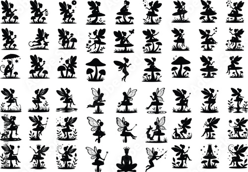 Fairy Sitting on Mushroom Silhouette – Magical Fantasy Design Set Enchanted Fairy on Mushroom Silhouette – Whimsical Vector Art Collection