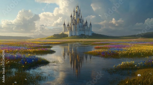 fairy tale, castle, meadow, flower, colourful, vibrant, landscape, spring, summer, cloud, sky, water, lake, duck pond, idylli, peaceful, serene, dreamy, magical, fantasy, romantic, whimsical, majestic, architecture, building, picturesque, nature, tranquil, sunset