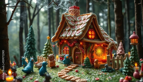 Fairytale cottage in the woods made of candy and gingerbread, smoke coming from the chimney, cozy lighting 2