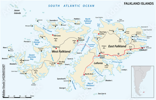 Falkland Islands, also Malvinas, vector road map