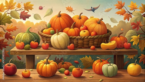 season, autumn, holiday, fall, thanksgiving, background, harvest, pumpkin, yellow, leaf, halloween, november, day, october, concept, nature, orange, composition, food, red, maple, beautiful, copy space, decoration, table, wood, design, plant, garden, celebration, vegetable, decor, happy, traditional, forest, seasonal, sun, topview, berry, autumn, festive, scene, natural, foliage, banner, gift, pattern, autumn leaf, thank