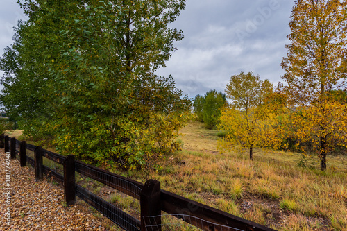 Fall landscape scene with cloudy sky, wood fence, and aspen trees in sloping terrain