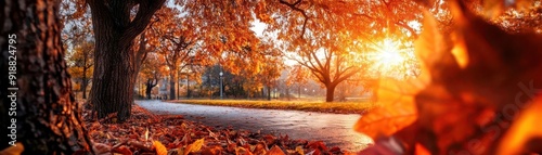 Fall park scenery, vibrant colors, lush environment, wide shot