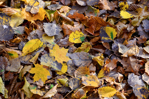 Fallen yellow leaves on the ground. Autumn maple leaf background. Dress warmer, go walking, the weather is cold