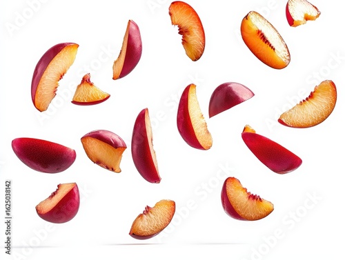 falling, identical, nectarine, slice, floating, air, isolated, white, background