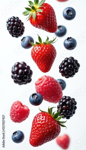 Falling mix of wild forest berries, strawberry, raspberry, blueberry, blackberry isolated on white background. Red ripe strawberries, blue round blueberries, dark blackberries. Flying fruits