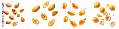 falling ripe lucuma fruits on white background, full depth of field, transparent background