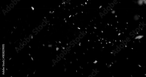 Falling snowflakes isolated on black background. Winter snow overlay texture for VFX, compositing, motion graphics and atmospheric effects
