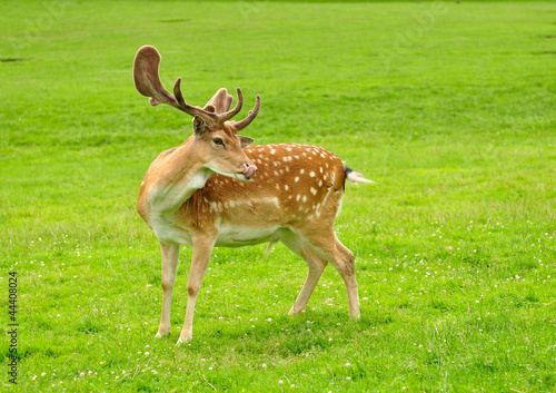 background, calf, countryside, cervid, ear, english, fallow, fur, grass, green, group, hind, horn, nature, oak, park, sun, sunny, tongue, tree, wild, wildlife, young