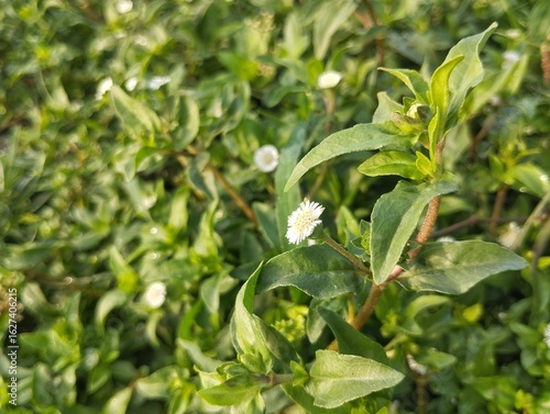 medicinal plant, herbal, traditional medicine, ayurveda, asteraceae, daisy family, white flower, wildflower, wild plant, green leaf, small flower, botanical, nature, flora, blooming, closeup, macro, garden, field, india, asia, hair care, skincare, natural, organic, healthy, wellness, alternative medicine, homeopathic, plant, leaf, stem, blossom, flora, sunlight, morning dew, vibrant, fresh, growing, wild, uncultivated
