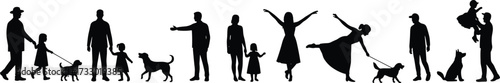 Family and pet silhouettes, walking dogs, lifting children, joyful poses, black icons, white background, bonding, play, care, lifestyle