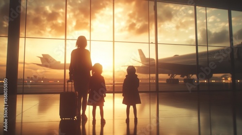 family, mother, children, aerodrome, travel, vacation, departure, sunrise, sunset, journey, plane, flight, baggage, terminal, waiting, tour tourism, destination, view, window, silhouette, golden hour, adventure, excitement, hope, anticipation, future, togetherness, happiness, love, memory, family time, motherhood, childhood, children, people, looking, watching, traveler, aeroplane, passenger