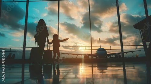 Family at airport travelling with young child and luggage walking to departure gate, girl pointing at airplanes through window, silhouette of people, abstract international air travel concept