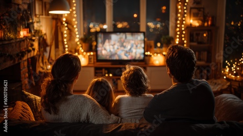 Family Bonding Moments: Cozy Evening on Couch Watching TV Together in a Warm, Charming Living Room Setting with Lights