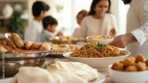 Family Celebrating Eid with Traditional Dishes and Lavish Feast