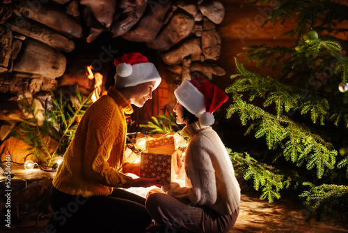 Family celebration of Merry Christmas and Happy New Year. Mother and daughter near burning fireplace open gift box.