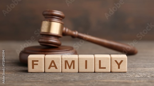 Family Concept with Wooden Letters and Gavel on a Table, Symbolizing Legal Matters, Relationship, and Family Law in a Courtroom Setting