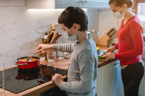 quarantine, family, kitchen, cooking, food, crisis, disease, virus, together, isolation, home, boy, children, woman, mother, son, mask, health, safety, protection, protective clothing, emergency, state of emergency, shutdown, preparing, stirring, pot, activity, chore, lifestyle, domestic, young, people, person, caucasian