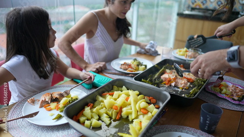 Family eating lunch at home. Mother and daughter seated around food. People gathered together