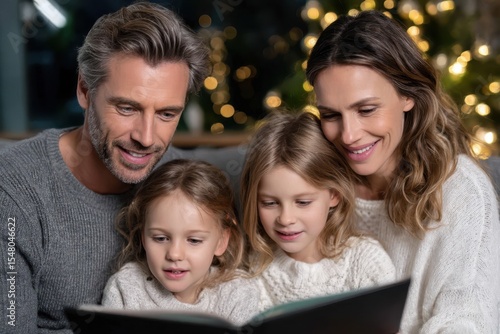 Family enjoying storytime together in cozy living room during holiday season