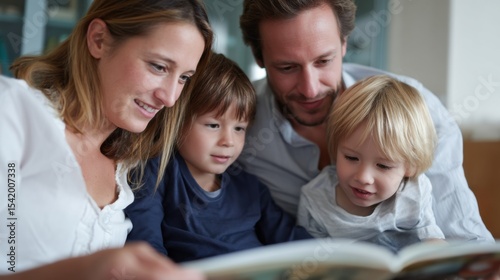 Family enjoys cozy moment together, reading book and sharing smiles. children are engaged and curious, creating warm atmosphere of love and togetherness