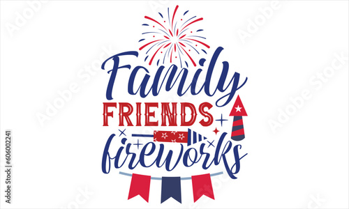 Family Friends Fireworks - Fourth Of July SVG Design, Hand lettering inspirational quotes isolated on white background, used for prints on bags, poster, banner, flyer and mug, pillows.