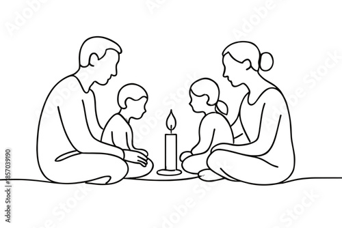 family, candle, togetherness, connection, children, oneness, warmth, gathering, line art, minimalist, illustration, home, childhood, parenting, love, bonding, storytelling, tradition, peace, calm, serenity, intimacy, sharing, moment, together, family time, domestic, simple, drawing, outline, symbol, comfort, domestic life, indoor, evening, night, family portrait