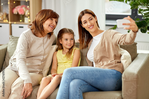 family, generation and technology concept - happy mother, daughter and grandmother taking selfie by smartphone at home